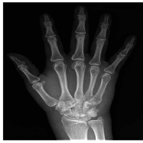 Imagen 2: Radiografía de mano derecha. No lesiones óseas, ni articulares, se observa edema de tejidos blandos a nivel de metacarpofalángicas.