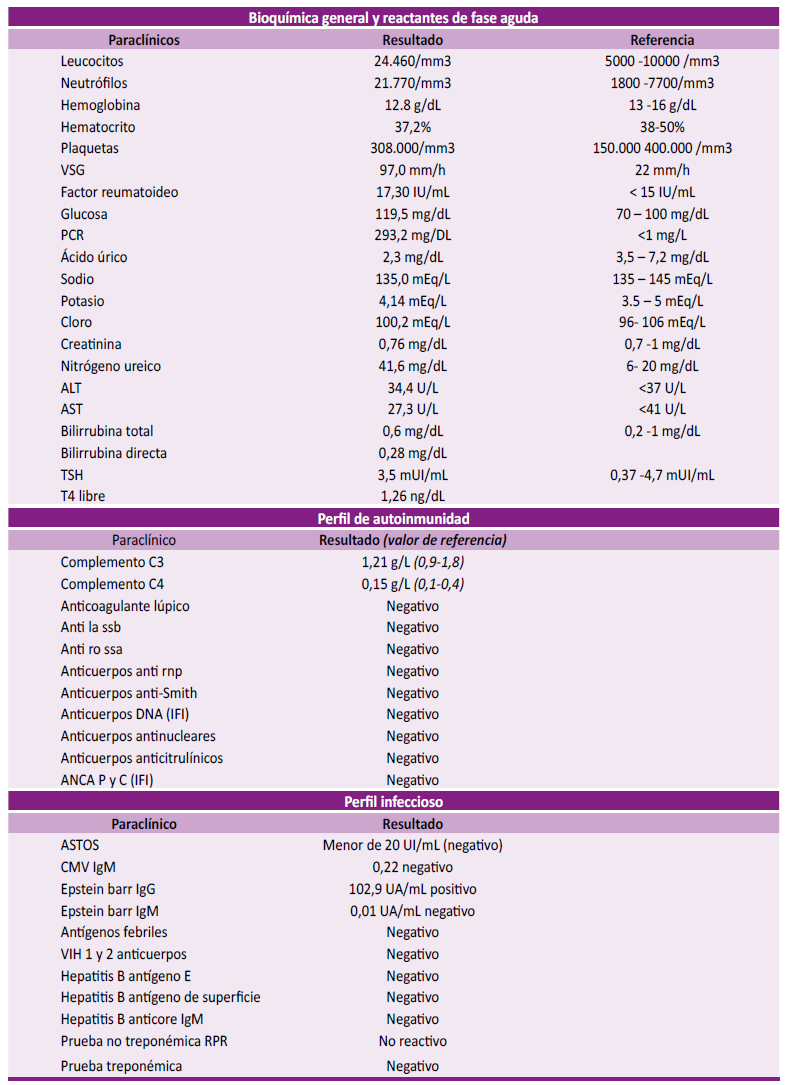 Los paraclínicos iniciales muestran leucocitosis con neutrofilia y PCR (Proteína C reactiva) elevada, resto de límites normales (Ver tabla 1). Se amplían estudios con perfil infeccioso, metabólico y autoinmune dentro de límites normales excepto por un factor reumatoide positivo; radiografía de tórax dentro de límites normales y radiografía de manos sin alteraciones óseas con edema de tejidos blandos (Ver imagen 2). El rastreo microbiológico solicitado al ingreso da preliminar a las 29,7 horas de morfología indeterminada, con cubrimiento antibiótico empírico con ampicilina sulbactam a dosis de 3 gramos cada 6 horas.
