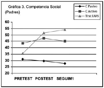 Con relación a la competencia social informada por los padres (Gráfica 3) se observa en el grupo de tratamiento IAFS un resultado semejante a la presentada en la versión del tutor, es decir, un sustancial incremento de las puntuaciones en el postest con respecto al prestet, y una continuidad al alza de las mismas en el seguimiento. El grupo de control activo también incrementa sus puntuaciones en el postest, pero no en la misma tasa que lo hace el grupo de tratamiento IAFS, sin embargo, se reducen las puntuaciones en la fase de seguimiento. El grupo de control pasivo decrementa sus puntuaciones con respecto al pretest, en los momentos evaluadores subsiguientes, en el postest y en el seguimiento.