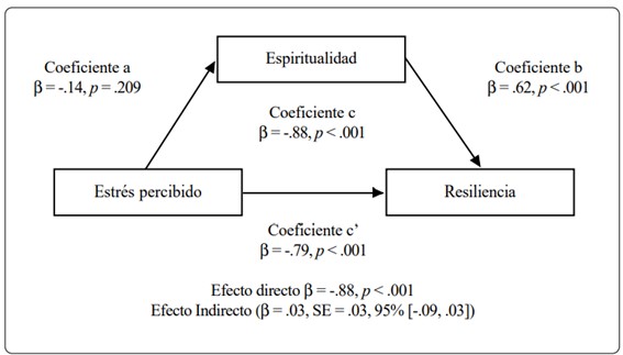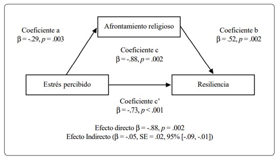 Para realizar el análisis de mediación se ha de considerar de manera previa la relación existente entre las variables que se pretenden poner a prueba (Frazier et al., 2004). En este caso, la correlación entre el estrés y las variables afrontamiento religioso, espiritualidad y resiliencia presentaron una correlación negativa y estadísticamente significativa, por lo que se procedió a realizar el análisis con base en los lineamientos de Hayes y Preacher (2014); primeramente, con la variable afrontamiento religioso y, posteriormente, con la variable espiritualidad.