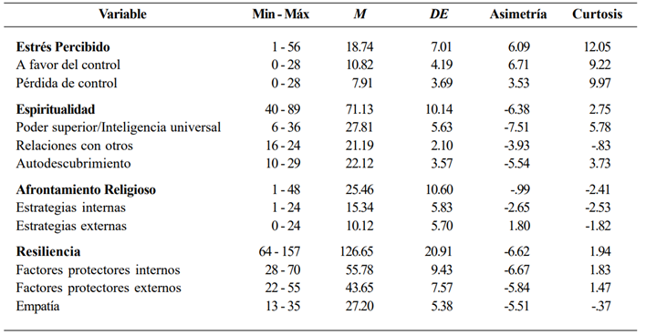 Se realizaron análisis descriptivos de todas las variables de estudio, así como la prueba de normalidad univariada y multivariada, el análisis de correlación a través de la prueba de Pearson y los análisis de regresión. Los análisis estadísticos de mediación se realizaron con la macro PROCESS (Hayes & Preacher, 2014) mediante técnicas bootstrapping (modelo 4 y un nivel de confianza del 95%). Los criterios de Baron y Kenny (1986) fueron utilizados para realizar este análisis, utilizando el paquete estadístico para las ciencias sociales IBM-SPSS en su versión 26. Con base en los valores estandarizados de la asimetría y curtosis de las variables de estudio se determinó que no existe normalidad en los datos, según lo sugerido por Tabachnick y Fidell (2013), excepto en afrontamiento religioso y sus dos dimensiones. Sin embargo, se tomó la decisión de proseguir con los análisis sin realizar una transformación de los datos, puesto que no es lo más recomendable (Moral de la Rubia, 2006).