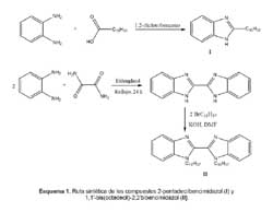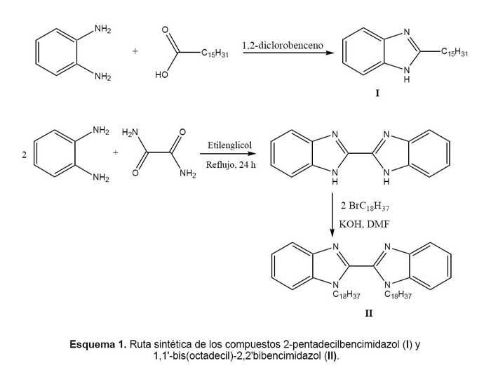 Los compuestos I y II fueron preparados según el esquema 1. La síntesis del 2-pentadecilbencimidazol se realizó utilizando el 1,2- diclorobenceno como solvente, a diferencia de otros métodos que realizan la reacción sin solventes,16 en HCl 4M 17 o ácido polifosfórico.18 El compuesto obtenido inicialmente fue de color marrón oscuro por lo que fue necesario recristalizarlo varias veces con hexano.