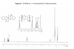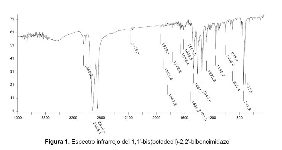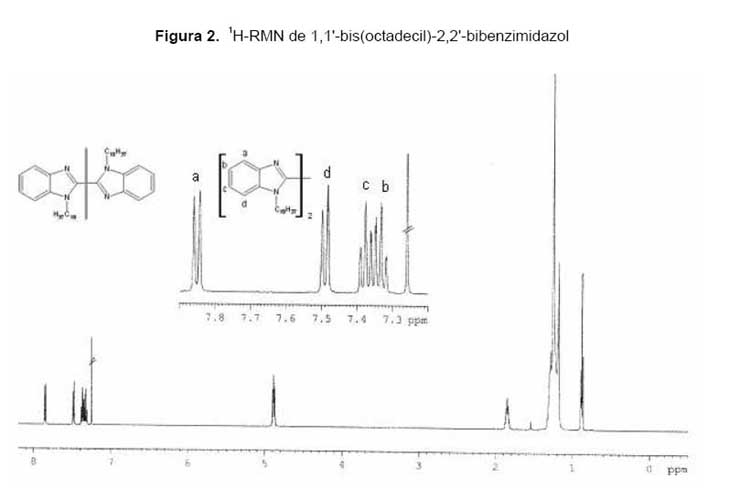 El espectro infrarrojo del 1,1'-bis(octadecil)-2,2'-bibencimidazol presenta señales muy intensas correspondientes a los numerosos enlaces C H aromáticos 3048 y alquílicos 2925 y 2858 cm-1, Figura 1. Al mismo tiempo ya no se observan las señales debidas al grupo NH del 2,2'-bibencimidazol que aparecen en la misma región. El espectro 1H-RMN de II, Figura 2, es concordante con lo reportado por la literatura, el grupo metileno próximo al nitrógeno aparece a 4,90 ppm,20 mientras que en nuestro caso esta señal se presenta a 4,89 ppm. Existe un centro de simetría en la molécula, lo que simplifica el espectro 1H-RMN. Los protones correspondientes al resto aromático no son equivalentes por lo que cada uno emite una señal diferente.