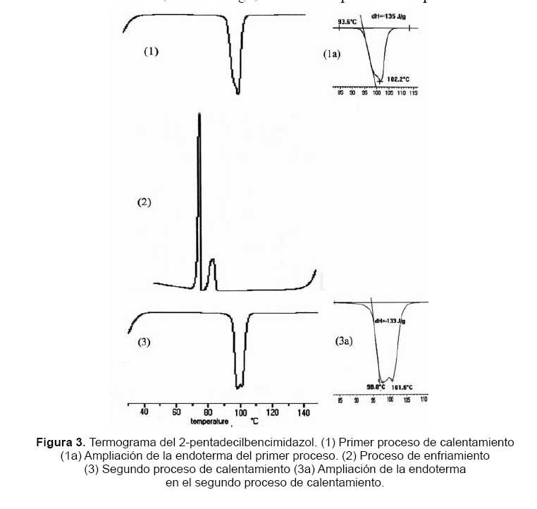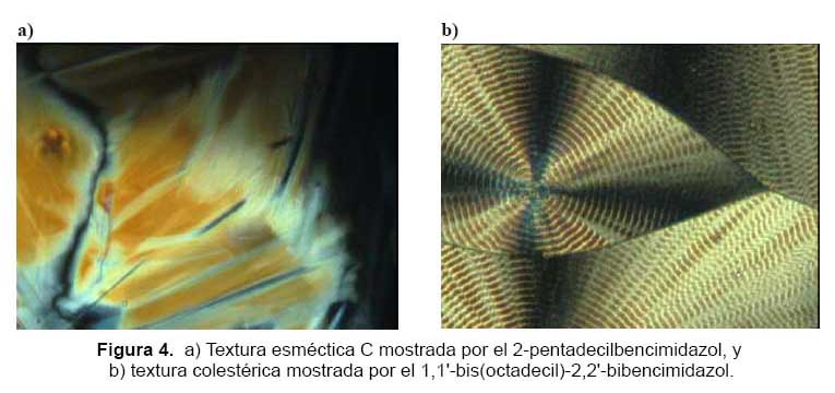 Los termogramas de II para el primer y segundo proceso de calentamiento son idénticos, a excepción de un pequeño pico exotérmico que aparece en el segundo calentamiento a 83 °C; sin embargo, al microscopio con luz polarizada no se observa ningún cambio a esta temperatura. Durante el calentamiento, II pasa directamente del estado sólido al estado líquido a 93.5 °C, pero durante el enfriamiento se observa la aparición de una fase colestérica o nemática quiral (N*) a 56 °C caracterizada por anillos concéntricos, Figura 4b. La presencia de esta fase colestérica no es normal, pues ella se presenta en compuestos con centros quirales. La rotación restringida en el enlace que une los grupos bencimidazol, debido a la presencia de las largas cadenas alifáticas, no es suficiente para generar estructuras quirales puesto que la molécula posee un centro de inversión. Una posible explicación es que II esté contaminado con trazas del compuesto parcialmente alquilado, el 1-octadecil-2,2'-bibencimidazol, el que sí podría generar estructuras quirales. Sin embargo, esta posible contaminación de II no ha sido detectada por RMN; además, el análisis elemental de este compuesto es concordante con los valores esperados. La cristalización se da a 28 °C.