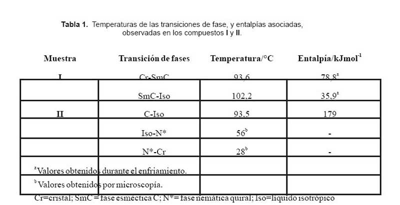 a Valores obtenidos durante el enfriamiento. b Valores obtenidos por microscopía. Cr=cristal; SmC = fase esméctica C; N*= fase nemática quiral; Iso=líquido isotrópico