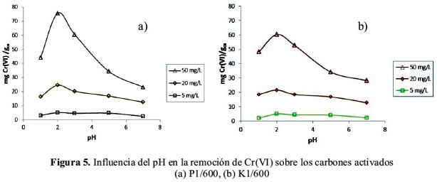 El carbón activado P1/600 presentó la mayor capacidad de adsorción con un valor de 75,2 mg/g a pH=2 en comparación con su homóloga K1/600 que alcanzó una capacidad de adsorción de 60,68 mg/g al mismo pH. Un comportamiento similar se observó en el trabajo reportado por Kharthikeyan et al.11 quienes usaron carbones activados con H3PO4 preparados a partir de aserrín de madera (Hevea brasilinesis), estos investigadores reportaron para sus carbones una capacidad de remoción de 42 mg Cr(VI)/ gca a un pH=2.