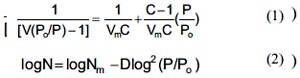 La caracterización textural de los carbones activados se realizó por adsorción de N2 a la temperatura de 77K, utilizando un equipo Micromeritics modelo GIQ-UPV. Los materiales fueron previamente desgasificados a 200°C por un tiempo de 12 h, con el objeto de eliminar el agua fisisorbida y posibles impurezas que hubiera en la superficie del sólido. Para la determinación del área superficial y volumen de microporos se utilizaron las ecuaciones de Brunauer-Emmett-Teller (BET)9 (Ec.1) y de Dubinin-Radushkevich (D-R) (Ec.2):