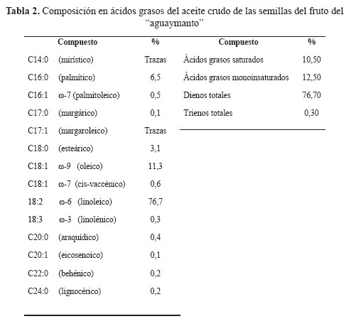 En el aceite crudo de las semillas del fruto del "aguaymanto", se identificó 14 ácidos grasos; el ácido graso predominante fue el ácido linoleico (76,7%), seguido por el ácido oleico (11,3%); ácidos grasos saturados (10,50%); ácidos grasos monoinsaturados (12,50%); dienos totales (76,70%) y trienos totales (0,30%) (Tabla 2). Estos resultados están de acuerdo a los datos reportados por Ramadan3. El ácido linoleico es considerado un ácido graso esencial muy importante para prevenir enfermedades cardiovasculares, arterioesclerosis e hipertensión. Los ácidos grasos poliinsaturados también son importantes en el mantenimiento de la membrana celular, en la producción de prostaglandinas, entre otros. Por lo que el consumo de estos aceites es importante porque también sirven como medio de transporte de las vitaminas liposolubles (A,D,E y K) y porque regulan el metabolismo del colesterol.