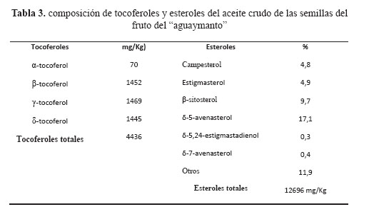 Los esteroles δ-5-avenasterol (17,1%), β-sitosterol (9,7%), estigmasterol (4,9%) y campesterol (4,8 %) (Tabla 3), son las especies más importantes cuantificadas por CG; mientras que para Ramadan14, los esteroles campesterol y β-sitosterol son los componentes mayoritarios. La importancia del consumo de alimentos con alto contenido de esteroles está basado en evidencias científicas respecto al efecto hipocolesterolémico15, por lo que el consumo de esta fruta podría reducir los niveles de colesterol y prevenir enfermedades cardiovasculares, entre otros.