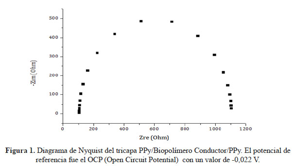 La resistividad iónica del dispositivo desarrollado se determinó a partir de su espectro de impedancia, para ello, se tomó 1 cm2 del tricapa PPy/Biopolimero/PPy, que fue conectado previamente en medio de dos placas de acero inoxidable y posteriormente al potenciostato/ galvanostato Parstat 2263, Princeton Applied Research, la conductividad encontrada a partir del diagrama de Nyquist (Figura 1) fue de 3,022 x10-5 S.cm-1, ubicándolo en el rango de los semiconductores5, 6,7. La celda electroquímica consistió, en un sistema donde el tricapa queda en medio de dos placas de acero inoxidable, un lado de la placa se conectó al EA previamente cortocircuitado con el ER y el otro lado se conectó al EW.