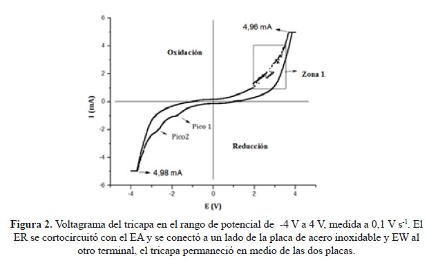Por otro lado, se realizó un análisis con la técnica de voltametría cíclica (VC) del dispositivo tricapa con área de 4,5 cm2. Este estudio se llevó a cabo mediante 4 rangos de potencial, de -1 V a 1 V, -2 V a 2 V, -3 V a 3 V y -4 V a 4 V. En los pulsos de -1 V a 1 V y -2 V a 2 V no se observó proceso redox. En tanto que para los últimos rangos de potencial (-3 V a 3 V y -4 V a 4 V), en la onda de oxidación se observaron bifurcaciones a 2 V y 3 V, con corrientes de 2 y 3 mA(Figura 2), además de dos picos bien definidos (pico 1 y pico 2), correspondientes a dos procesos de reducción del PPy1, las bifurcaciones pueden deberse a un fuerte proceso de oxidación de las películas de PPy asociada con ruido electrónico. La celda electroquímica empleada en este sistema es similar a la usada en el análisis de EIS.