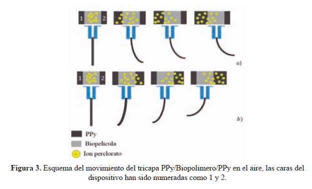 En la Figura 3 se presenta un esquema de movimiento del tricapa que responde a estímulos eléctricos en el aire, en donde se presentan las distribuciones de los iones perclorato durante el proceso redox.