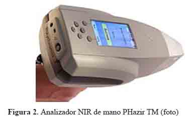 Hardware y software. Los espectros de reflectancia fueron adquiridos con un espectrofotómetro NIR con analizador de mano PHazir TM. (Polychromix, Inc.) controlado a través del software Polychromix Phazir TM MG; cada espectro fue el resultado de 5 scans. En la figura 2 se muestra el equipo utilizado. Los espectros se registraron en un rango de longitudes de onda de 1600-2400 nm con una resolución de 12 nm. El software Unscrambler V. 9.8 de Camo Process (Trondheim, Noruega) fue utilizado para el tratamiento matemático.