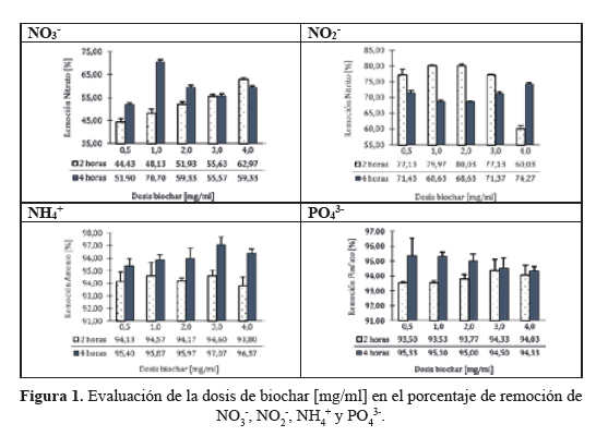 En la figura 1 se observa que los mejores porcentajes de remoción se obtuvieron tiempo de contacto (TC) de 4 horas con la excepción del ión NO2-, lográndose una remoción mayor al 90 % para PO43- y NH4+; puesto que se ha demostrado que estos iones presentan una mejor eficiencia en su remoción en comparación con otros13,14. La figura 2 demuestra que la capacidad de remoción de PO43- y NH4+ no se ve influenciada por la dosis de biochar ni por el TC en los rangos estudiados; puesto que al aumentar la dosis de biochar y el TC no hubo una mejora significativa en la remoción de iones. El NH4+ logra alcanzar su mayor porcentaje de remoción en un TC de 1h utilizando Biochar producido a partir de aserrín de roble13.