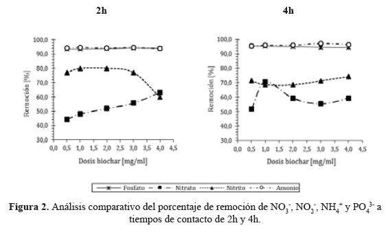 Para el PO43- y NH4+ se observa que los mejores porcentajes de remoción se presentan en tiempos de contacto mayores a 3 horas y dosis de biochar superiores a 1 mg/ml para el NH4+ y menores a 2,5 mg/ml para el PO43; como se muestra en la tabla 1, el NH4+ es el ion de mayor concentración que presenta las aguas residuales, por tal motivo necesita mayores concentraciones para una mejor remoción.