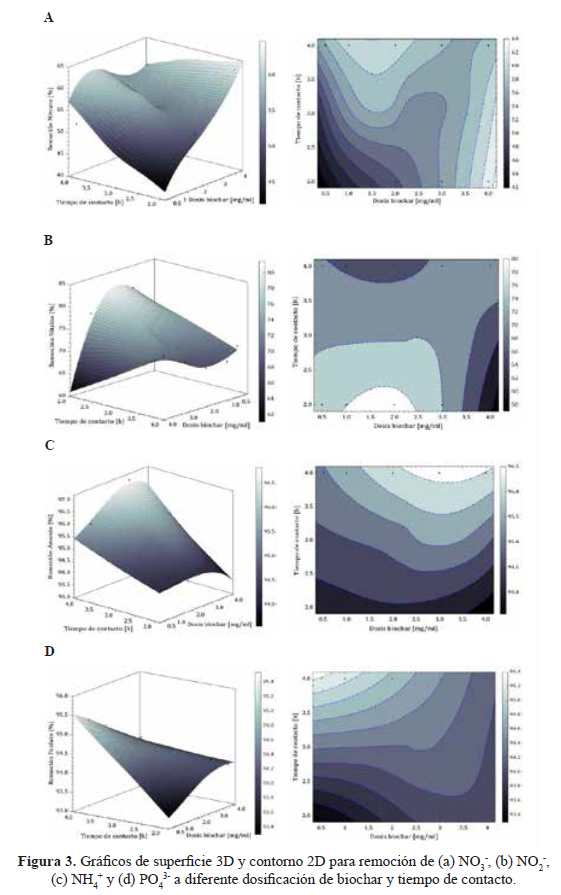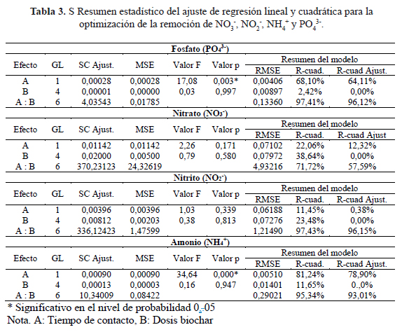 Se ha realizado un ajuste de modelos con efecto lineal y cuadrático sobre las variables de estudios (dosis de biochar y el tiempo de contacto) para poder optimizar la remoción de NO3-, NO2-, NH4+ y PO43-. La tabla 3 presenta el resumen estadístico del ajuste de modelos, se muestra solamente que el modelo depende del tiempo de contacto sobre la remoción de fosfato y amonio su ajuste explica el 64,11 % y 78,90 % de la variación total en los datos sobre el promedio, respectivamente. Asimismo, estos modelos son estadísticamente signicativos a nivel de probabilidad de 95 %, mostrado un p = 0,003 para fosfato y un p = 0,000 para amonio. Por lo tanto, se interpreta que el aumento del tiempo de contacto tiene efectos crecientes sobre la remoción de estos contaminantes. Adicionalmente, para mejorar y optimizar la remoción simultanea de NO3-, NO2-, NH4+ y PO43-, se ajustaron modelos cuadráticos que expliquen la mejora de las interacciones bivariadas sobre la remoción; se demostró que el ajuste de los modelos sobre la remoción mejora cuando se estudian efectos bivariados, porque explican alrededor del 95 % de la variación de la data. El nitrito, fosfato y amonio presentan un R2 de 96,15 %; 96,12 % y 93,01 % que explica la validación del modelo para la optimización del modelo; sin embargo, el modelo del nitrito es solo explicado por un 57,59 % de la variación total de la data.