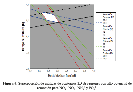 La figura 4 presenta la región óptima de remoción de los iones por superposición de gráficas de contornos, siendo la región estimada en un tiempo de contacto entre 3,5 3,8 h y dosis de biochar 1,25 1,75 mg/ml.