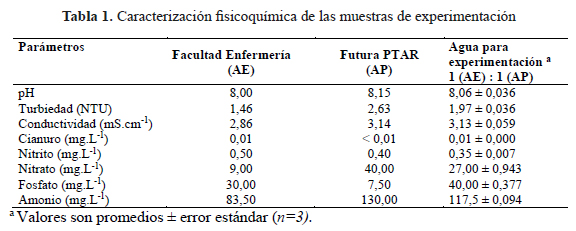 Las muestras de agua residual fueron tomadas de los colectores principales de la Universidad Nacional de Trujillo (Facultad de Enfermería y a la llegada de la futura Planta de Tratamiento de Aguas), las cuales son producto de las actividades propias de la institución como son aguas sanitarias, los comedores y los generados por las actividades en los laboratorios tanto de investigación como de enseñanza. Respecto a la caracterización de las muestras se analizaron el pH, conductividad eléctrica (uS/cm), y turbidez (NTU), siendo analizados a través del multiparámetro Termo Fisher Scientific; la concentración inicial de iones NO3-, NO2-, NH4+ y PO43- se determinaron mediante tests colorimétricos Visocolor Eco y Fotómetro PF-12 Macharey Nagel en el Laboratorio de Investigación de Aguas (LIA) de la Universidad Nacional de Trujillo.