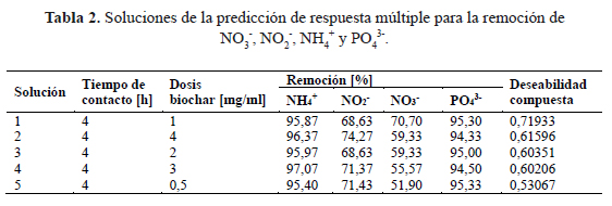 La tabla 2 presenta las soluciones de la predicción de respuesta múltiple para la remoción de los iones, donde se evaluó cinco posibles soluciones y se verificó que el mejor tiempo de contacto para obtener los mejores porcentajes de remoción es de 4h; sin embargo, se encontró que 1 mg/ml es la mejor dosis de biochar obteniendo una deseabilidad compuesta del 71,9 % de la remoción de los iones estudiados; también se encontró que 4 mg/ml de dosis de biochar a 4h de tiempo de contacto nos da una deseabilidad compuesta del 61,5 % de remoción; pero en términos de rentabilidad para la aplicación de biochar en la remoción de iones, las condiciones de la solución 1 son las deseables para esta aplicación15.