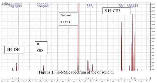 13C-NMR (benzene-d6, 100MHz): showed five methyl groups at δ9.4, 23.7, 24.0, 25.1 in two aromatic rings and 51.4 for the methyl ester. It also showed two carbonyl esters at δ 163.5 and 172.2 and showed an aldehyde group at δ 193.4 ppm in C-3. See figure 2.