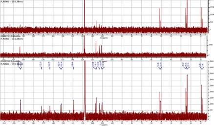 1H-NMR (benzene-d6, 400MHz): δ (ppm) 12.70, 12.65, 12.44 (each 1H, s, Ar-OH), 10.24 (1H, s, -CHO), 6.28 (1H, s, Ar-H), 3.25 (3H, s, - CO2Me), 2.33, 2.11 (each 3H, s, Ar-Me 5 and 6), 2.23 and 2.25 (each 3H, s, Ar-Me 3’ and 5’). See figure 1.