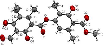 This compound called trullarin is new according to the PUCP BASE OF SCIENCE FINDER. Its chemical name is: (Methyl-2,6-dimethyl-4-(3-formyl-2,4-dihydroxy-5,6-imethylbenzoyloxy)-3'-hydroxybenzoate). HRESIMS (negative mode): m / z 387.1071 [M- H] + (calculated for C20H19O8: 387.1080). The title compound named trullarin, C20H20O8, crystallizes with one molecule in the asymmetric unit in the monoclinic centrosymmetric space group P21/n with the following unit cell parameters: a = 11.0400(3) Å, b = 11.2752(3) Å, c = 14.7893(4) Å, α = γ = 90°, β = 109.074(2)°, V = 1739.87(8) Å3, Z = 4. Figure 3 shows
