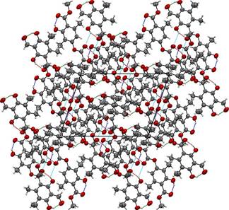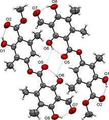The molecular packing of trullarin is influenced by both intramolecular and intermolecular forces. Intramolecular forces determine molecular shape, which in turn play an important role in determining the most effective ways of packing the molecules in the crystal [13]. In the structure, there are three intramolecular hydrogen bonds of O-H···O type. The O1···O2, O5···O6 and O7···O8 intramolecular hydrogen bonds generate a six-membered rings (Table 3 and Fig. 4). Furthermore, one intermolecular hydrogen bond of O-H···O type, O5·O6, links adjacent molecules into dimers (Table 3 and Fig. 4). The dimers form twelve-membered rings and present an anti-parallel orientation along an axis. The packing diagram in Fig. 5 shows the stacking pattern of trullarin, viewed along the [010] direction. The chemical structure obtained by single crystal XRD agrees very well with NMR spectroscopy data.