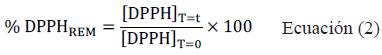 donde (DPPH)T=t corresponde a la concentración de DPPH en el medio después de la reacción con el extracto y el control positivo y [DPPH]T=0 es la concentración inicial de DPPH.