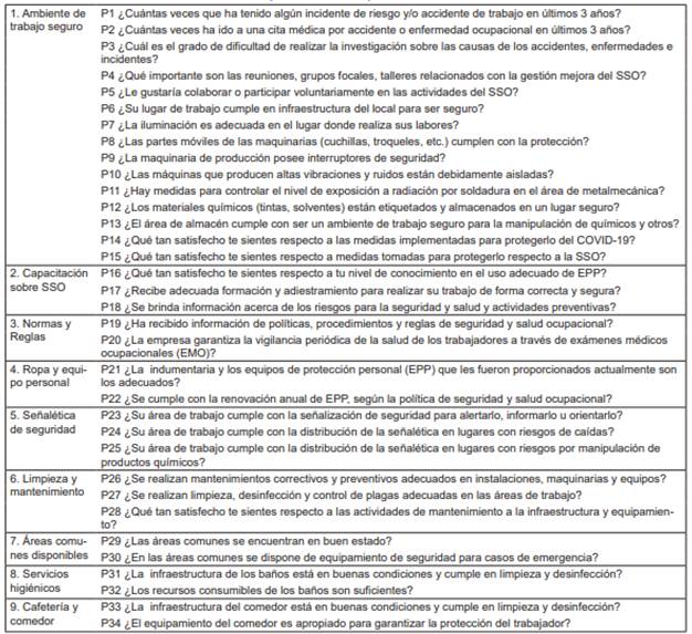 La encuesta se diseñó como un cuestionario con 34 preguntas para analizar 9 dimensiones tomados del estudio de Brunette (2003), como se muestra en la Tabla 4. Además, se utilizan preguntas politómicas que utilizan una escala de Likert de cinco puntos para medir diferentes constructos. La escala Likert (1932) es una de las más utilizadas para la medición de actitudes. Según Ospina et al. (2005), la escala de Likert permite determinar un orden de objetos, clasificando individuos en función del grado en que poseen un cierto atributo, pero no aporta una idea de la distancia que existe entre estos. En este caso, se hace uso de 5 grados ordinales tal como se observa en la Tabla 3. Al procesar las respuestas de la encuesta, se consideró el indicador índice de la protección del trabajador (IPT), que es un índice porcentual calculado a partir de la suma de las respuestas de las encuestas (junio de 2020) dividido entre 7820 puntos máximos obtenidos de multiplicar 34 preguntas de 5 puntos máximos y 46 trabajadores, es decir, 34x5x46. Con ello se puede recolectar la data necesaria y se obtiene una tabla que presenta las respuestas de 46 trabajadores y los resultados de 4 indicadores de la gestión de SSO anual en particular. Luego, se procede al procesamiento de dichos datos, para las pruebas de hipótesis aplicando el software SPSS 26.