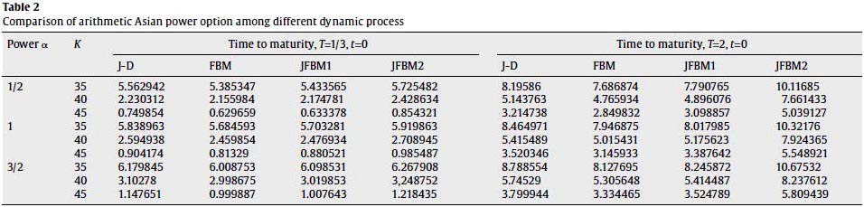 In the following set of numerical experiment presented in Table 2, we compare the theoretical prices of arithmetic Asian power option on the underlying asset driven by the different dynamic process: jump-diffusion process (H=0.5, λ=0.5136, hereafter J-D), fractional Brownian motion process (H=0.65 λ=0, hereafter FBM), and our jump fractional process (H=0.65, λ=0.5136, hereafter JFBM1 or λl=6.25, hereafter JFBM2). The riskless rate r is 0.05 and instantaneous volatility σ is 0.4.