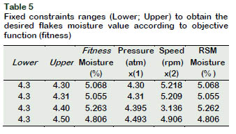Carvalho et al. (2012) reported moisture in breakfast cereals between 3.74 and 5.11%. Within these values 5 % moisture has been considered as suitable, and according to the contours surface determined by RSM, a low value and a high value of the independent variables pressure x(1) and speed x(2) located within the area desired (around 5 %) were delimited. The mathematical function obtained by RSM was used as a target function, and Lower and Upper limitations were established through Solver ga-Genetic Algorithm, having set up beforehand the number of stop iterations and the desired graphic display.