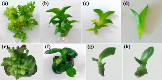 Figure 1 Effect of culture medium on Cattleya maxima Lindl. and Phalaenopsis amabilis (L.) Blume. multiplication at 90 days after sowing. (a) Effect of 6-Benzylaminopurine (BAP) on C. maxima for number of shoots, (b) Effect of banana flour on C. maxima for number of shoots, (c) Effect of 6-Benzylaminopurine (BAP) on C. maxima for shoot length, (d) Effect of banana flour on C. maxima for shoot length, (e) Effect of 6-Benzylaminopurine (BAP) on P. amabilis for number of shoots, (f) Effect of kinetin on P. amabilis number of shoots, (g) Effect of 6-Benzylaminopurine (BAP) on P. amabilis for shoot length, (h) Effect of banana flour on P. amabilis for shoot length.
