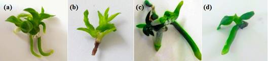 Conversely, the rooting experiment tested the effect of five different media: (i) MS + 4 g.L-1 agar; (ii) MS + 50 g.L-1 banana flour; (iii) MS + 4 g.L-1 agar + 0.005 g.L-1 Indol-3-butiric acid (IBA); (iv) MS + 4 g.L-1 agar + 0.003 g.L-1 Naphthalene acetic acid (NAA) and (v) MS + 4 g.L-1 agar + 0.003 g.L-1 2,4 Dichlorophenoxyacetic acid (2,4-D) on Cattleya maxima Lindl. and Phalaenopsis amabilis (L.) Blume given as a result ten treatments (Table 2), with a total of 36 repetitions for each.