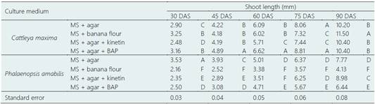 Shoot length of Cattleya maxima Lindl. and Phalaenopsis amabilis (L.) Blume in multiplication and rooting experiment