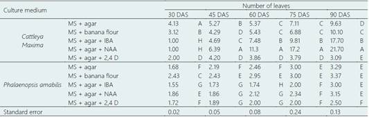 Table 6 Effect of different culture medium on the number of leaves in Cattleya maxima Lindl. and Phalaenopsis amabilis (L.) Blume in the multiplication experiment