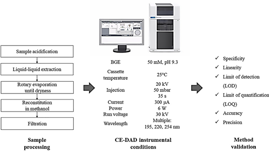 Figure 1 Schematic representation of sample processing and method validation steps for analysis of abscisic acid, 3-indolacetic acid and gibberellic acid in commercial plant biostimulants by CE-DAD.