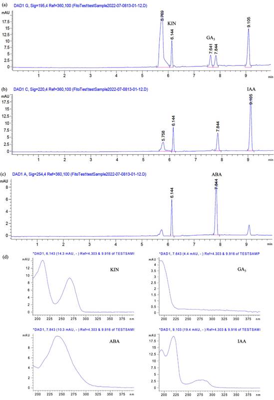 Regarding the absorption spectra of the phyto-hormones, Figure 2. illustrates the electro-pherograms of standard compounds at different wavelengths. Maximum absorbances were recorded simultaneously at 254, 220, and 195 nm for ABA, IAA, and GA3, respectively. At these wavelengths, good peak symmetry, response and resolution were observed. KIN (purity 99%) was considered during the preparation of the standard mixture of phytohormones. It showed absorption response at the established wavelengths, but it was not validated.