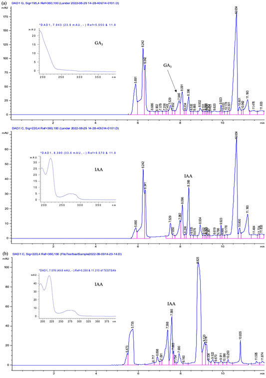 Notably, the present work employed liquid-liquid extraction with ethyl acetate after pH adjustment, which allowed the separation and detection of IAA and GA3. This technique based on the exchange of plant growth regulators among organic solvents and the acidified samples was previously proposed for the extraction and quantification of cited compounds in seaweed extracts by electrospray ionization mass spectrometry (ESI-MS) as well as HPLC (Prasad et al., 2010).