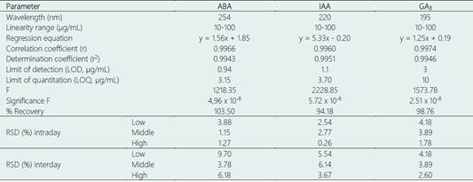 ABA: abscisic acid, IAA: 3-indolacetic acid, GA3: gibberellic acid GA3. RSD: Relative standard deviation.