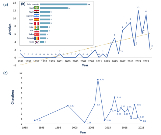 Figure 2 (a) Publications by years (b) countries with the highest number of publications, and (c) citations by years for sensory methods used in quinoa product development.