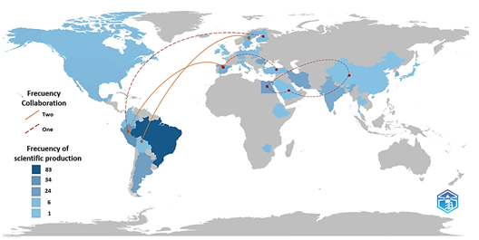 Based on the findings presented in Figure 3, the top 10 countries with the highest number of publications on the subject are Brazil, Peru, Argentina, Egypt, Spain, Iran, India, Turkey, Romania, and Korea. The collaboration frequency between countries that produce quinoa-based products is as follows: Peru and Spain, Sweden and Bolivia have a frequency of two, while Peru and Finland, Egypt and Saudi Arabia, China and Saudi Arabia, Egypt and China, and Spain and Turkey have a frequency of one. The number of scientific articles published by authors affiliated with institutions in each country where quinoa-based products are used highlights Brazil, Peru, and Argentina with 83, 34, and 24 documents, respectively.
