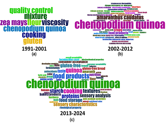 The analysis of 74 research papers on quinoa revealed a dynamic pattern in the word clouds generated from the frequency of keywords. From 1991 to 2001, the studies focused on understanding quinoa's physicochemical properties and general applications, marking the initial research phase on this valuable food resource (Figure 4a). From 2002 to 2012, the focus shifted to developing quinoa-based food products in combination with other Andean cereals, such as amaranth (Figure 4b). Finally, from 2013 to 2024, the research has been centered on formulating food and beverages that consider sensory and nutritional quality. In addition, there is a strong emphasis on developing gluten-free products (Figure 4c). These phases reflect the evolution of research and the scientific community's adaptation to the changing needs and trends in food production and nutrition, considering the sensory quality of the final product.