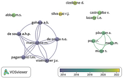 Figure 5 represents 6 clusters of different colors, indicating the authors' collaborations with various researchers regarding the development of quinoa-based products in a color gradient ranging from blue in 2014 to yellow in 2022. This review will cover the six largest clusters of collaboration. Cluster 1, colored blue, focuses on developing quinoa granolas for people with gluten intolerance (de Souza et al., 2014; Pagamunici et al., 2014). Cluster 2, colored green, involves Chiș et al. (2019) and Păucean et al. (2019), who are collaborating on developing quinoa bakery products. Cluster 3 shows that Ayub et al., 2021 are working together on researching probiotic beverages containing quinoa. Cluster 4 highlights the development of dairy products (Abdelmontaleb et al., 2021). Cluster 5 focuses on developing gluten-free bakery products (Jagelaviciute &Cizeikiene, 2021). Lastly, cluster 6 shows the most recent studies on products developed with quinoa (Chilón-Llico et al., 2022; Jamanca-Gonzales et al., 2022; Silva-Paz et al., 2023).