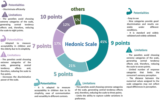 Figure 8 Potentialities and limitations of hedonic scales used. The works of Curia et al., 2001; Giovanni & Pangborn, 1983; McPherson & Randall, 1985; Peryam & Girardot, 1952; and Villanueva & Da Silva, 2009, provided an overview of the scales' potential and limitations.