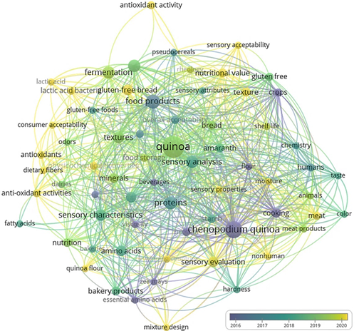 A minimum of three occurrences per keyword was required to analyze the correlation between keywords. This resulted in 66 words, which were used to form five clusters (Figure 6). The green cluster, comprised of 15 nodes, focuses on gluten-free foods and their formulation, sensory characteristics, and rheological and textural properties (Jagelaviciute &Cizeikiene, 2021; Peñalver et al., 2023). The yellow cluster, also with 13 nodes, explores using quinoa in meat products, considering factors like color, cooking, moisture, nutritional value, sensory properties, and shelf life (Tafadzwa et al., 2021; Teixeira et al., 2020). The red cluster, consisting of 16 nodes, highlights the protein content of quinoa, its essential amino acids, and its various applications in bakery products (Cizeikiene et al., 2021; Meriles et al., 2022). The blue cluster, also with 13 nodes, examines the sensory characteristics and acceptance of quinoa-based products, as well as consumer satisfaction, storage, and the use of milk additives (Curti et al., 2017; DeBruyne & Hekmat, 2024). Finally, the purple cluster, with 9 nodes, showcases the potential of quinoa in producing fermented foods and beverages (Bendezu-Ccanto et al., 2023; Jeon et al., 2022). All these clusters demonstrate the versatility of quinoa in different food products for nutritional improvement, including bakery and meat products. The following section will explore these products in more detail.