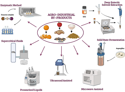 Conventional extraction techniques are being replaced with unconventional methods, such as ultrasound-assisted, microwave-assisted, and enzymatic extraction, to increase efficiency, yield, and reduce costs. Encapsulation, a cost-effective and efficient method of microencapsulation by spray drying in the food industry, has been complemented with techniques such as fluidized bed coating to enhance environmental protection. The increasing use of nanotechnology in encapsulating bioactive principles of scientific interest aims to obtain and apply bioactive compounds to food preparation for functional and/or nutraceutical properties. The physicochemical and sensory characterization of these food products has demonstrated that they improve quality, extend shelf life, and serve as natural additives (such as colorants, preservatives, and gelling agents). This applies to both beverages (such as juices and dairy drinks) and foods (including cold cuts and baked goods). Other industries are also exploring the development of these compounds because of their benefits, which generally improve product qualities and functions. In addition, they offer an alternative for animal feed, potentially reducing methane and nitrogen emissions from cattle feces. Research continues to explore bioactive compounds in agrifood byproducts, focusing on ways to utilize them for societal and environmental benefits.