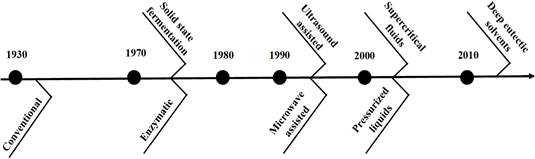 Deep Eutectic Solvent (DES) extraction: Deep eutectic solvent (DES) extraction involves mixtures with lower melting points and transition temperatures, making them an excellent alternative to organic solvents. They comprise a hydrogen bond acceptor and donor and are considered green or smart solvents. Notably, DES with natural constituents (natural deep eutectic solvents [NADES]) are also used to extract bioactive compounds from agroindustrial waste, achieving high efficiency, purity, and yield. (Saini et al., 2022). Phenolic compounds have been extracted from ripe mango peels using a lactic acid/sodium acetate/water mixture in a ratio of 3:1:4 through microwave-assisted extraction and from brewer's bagasse using choline chloride (ChCl) and microwave-assisted glycerol (Figure 1) (López et al., 2021; Pal & Jadeja, 2020). The development of conventional and non-conventional extraction methods over time is shown in Figure 2.