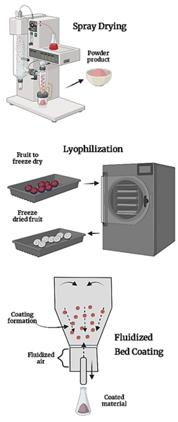 Freeze-drying or lyophilization: Freeze-dried microencapsulation is used for dehydrating and microencapsulating foods containing heat-sensitive compounds, such as anthocyanins. It involves freezing, sublimation, desorption, and storage stages. The encapsulating material is mixed with the core compound, homogenized, and stored for freeze-drying. An extract of leaves soursop was microencapsulated with phenolic compounds, maltodextrin, and gum Arabic (Jordan, 2019). A study on blueberry processing byproducts found that the productivity of microcapsules in anthocyanin extract is influenced by the concentration and type of encapsulating agent (Castagnini et al., 2019).