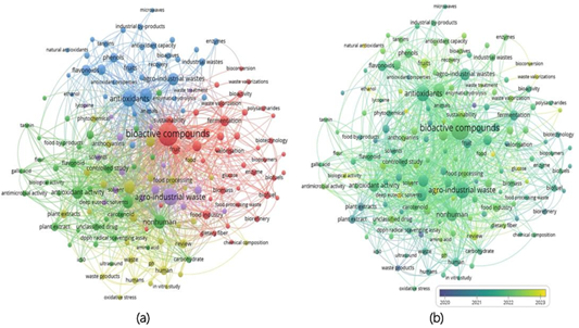Figure 6 (a) Network map visualization of author keyword co-occurrence. (b) Visualization of keywords in recent years (2020-2024). Data was obtained from Scopus (Keywords: "Agroindustrial" AND "Waste" AND "Bioactive-compounds") and using VOSviewer.