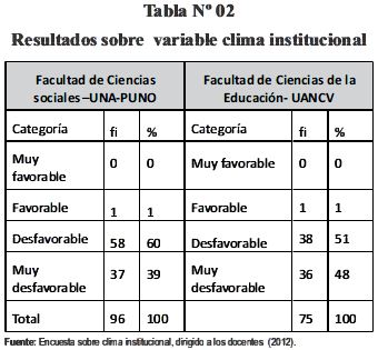 INSTITUTIONAL CLIMATE AND ITS IMPACT ON THE JOB PERFORMANCE OF TEACHERS OF THE FACULTY OF SOCIAL SCIENCES NACIONAL UNIVERSITY OF ALTIPLANO AND FACULTY OF EDUCATION UNIVERSITY ANDINA NESTOR CACERES VELASQUEZ - PERÚ 2012